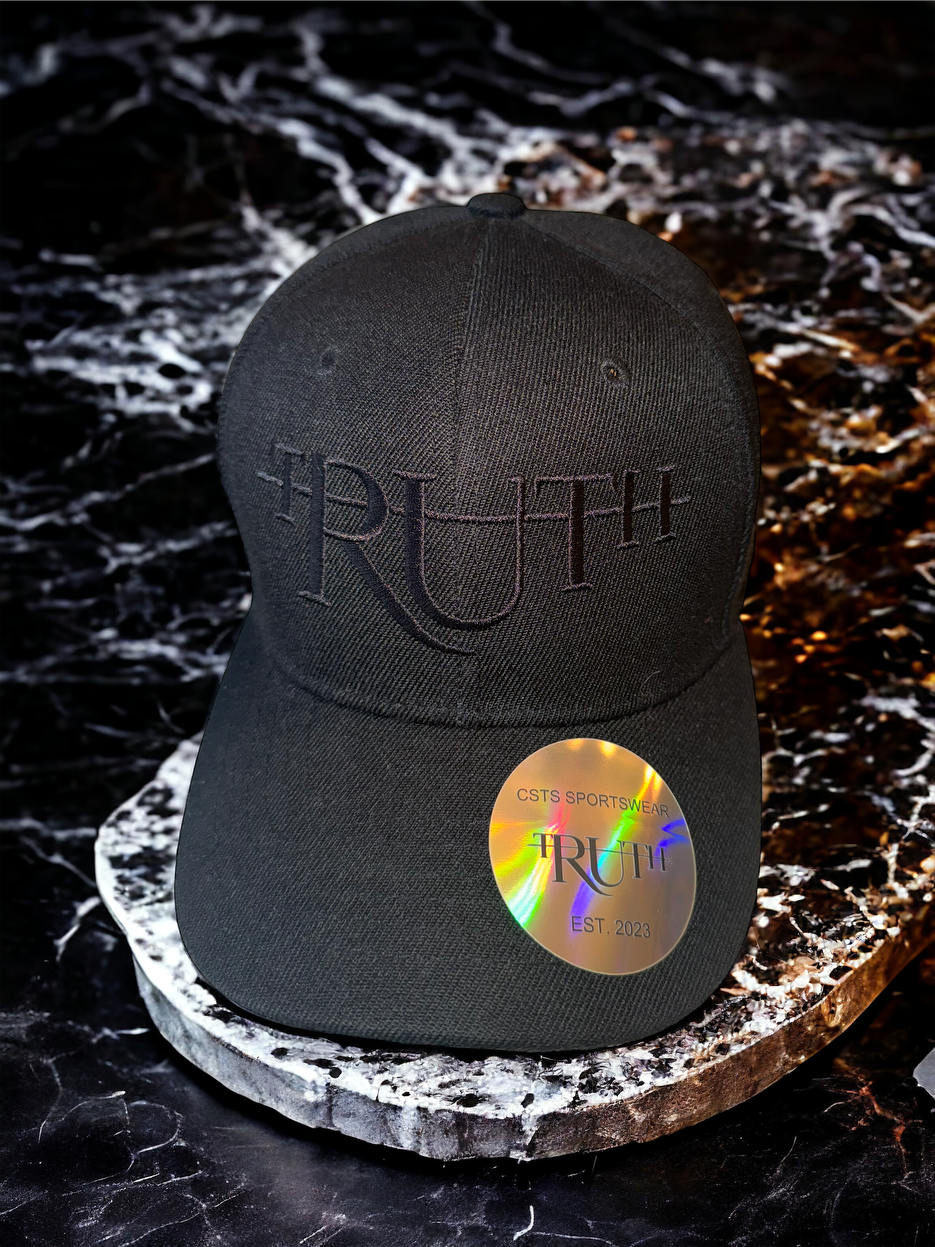 This is a sleek and ultra-stylish snapback hat featuring an all-black monochrome design. It showcases a deep black crown and matching flat brim, creating a minimalist and sophisticated look. The word “TRUTH” is subtly embroidered on the front in black letters, using a unique font style that incorporates cross-like elements on the “T”s. The tonal embroidery blends seamlessly with the rest of the hat, giving it a refined and understated appearance while maintaining a powerful and symbolic design.