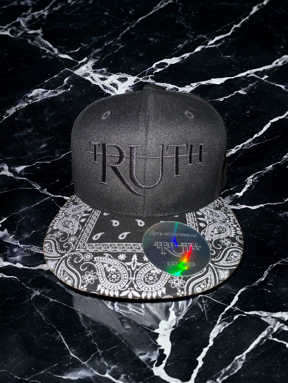 The brim of the hat is adorned with a black and white paisley bandana pattern, adding a bold and fashionable contrast to the plain crown. A holographic sticker on the brim displays the branding CSTS SPORTSWEAR and the text TRUTH EST 2023 enhancing the hat’s authenticity and streetwear appeal.