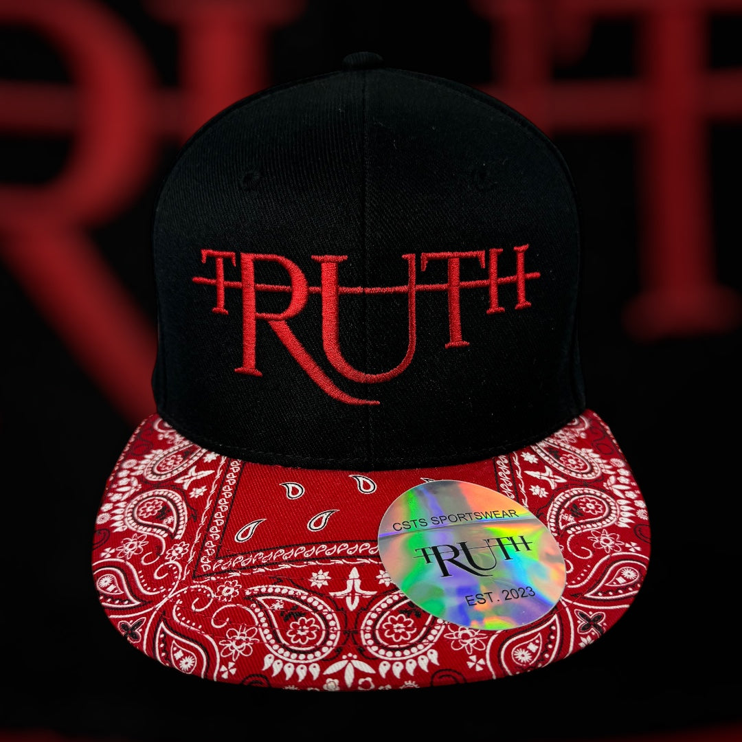 This hat is a stylish snapback featuring a bold and striking design. The crown is black with the word “TRUTH” embroidered in vibrant red using a unique, gothic-style font that incorporates crosses into the lettering, giving it a distinctive and edgy look. The brim of the hat showcases a red bandana pattern, adding a touch of streetwear flair with its classic paisley designs.