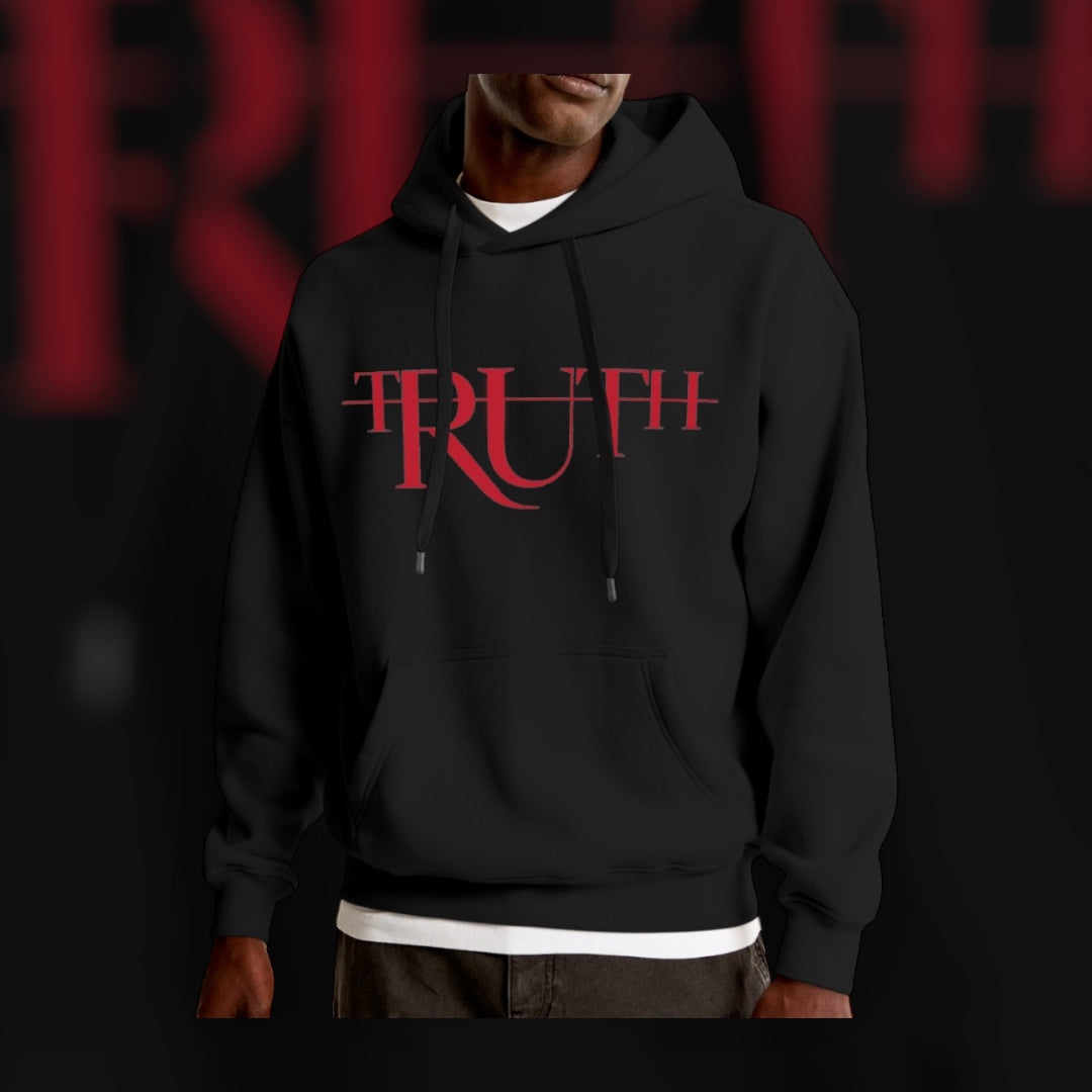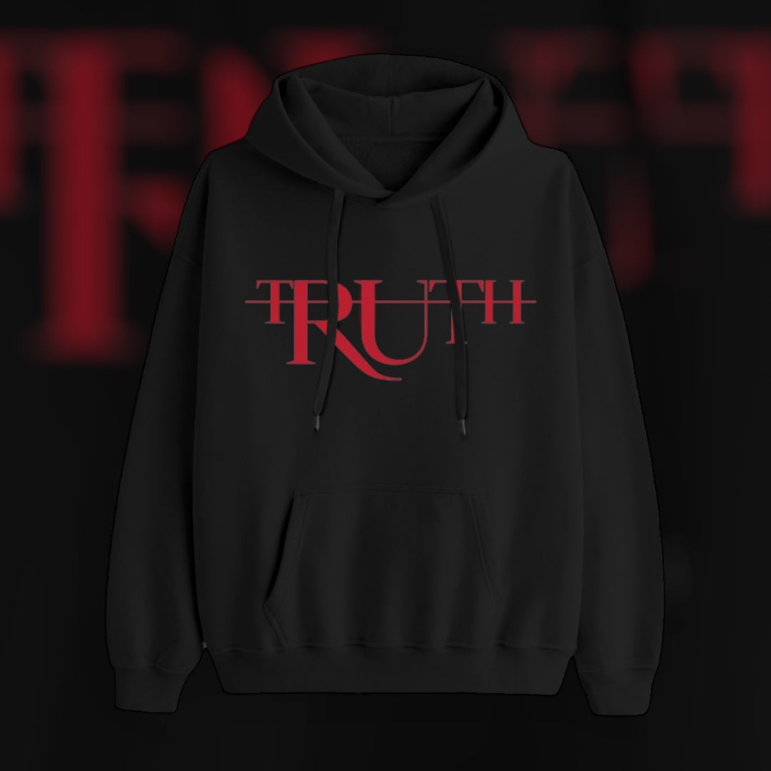 This is a black hoodie featuring a striking red graphic of the word TRUTH on the front. The design is creatively styled with bold, uppercase letters, where the R has an elongated, curved tail that intersects the other letters, giving it an artistic and dynamic appearance. Horizontal lines cut through the text, adding a minimalist yet edgy feel. The hoodie has a classic design with a drawstring hood and a front kangaroo pocket, making it both stylish and functional.