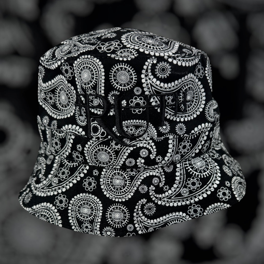 This is a stylish black bucket hat featuring a bold white paisley pattern that covers the entire surface. The intricate paisley design is composed of swirling floral and circular motifs, giving it a traditional yet modern look. Overlaid on the patterned background is the word “TRUTH” in a subtle black-on-black embroidery, blending seamlessly with the design while maintaining an elegant, minimalist feel. The monochrome color scheme and detailed pattern make this hat a versatile and fashionable accessory, suitable for streetwear and casual outfits.
