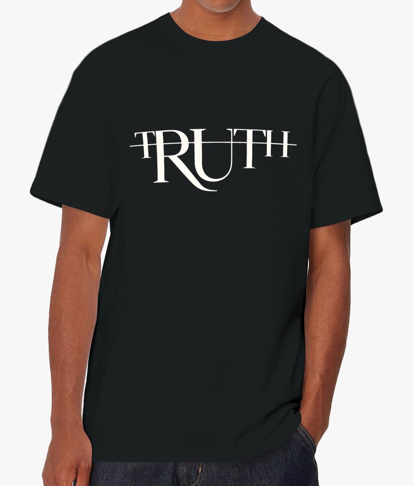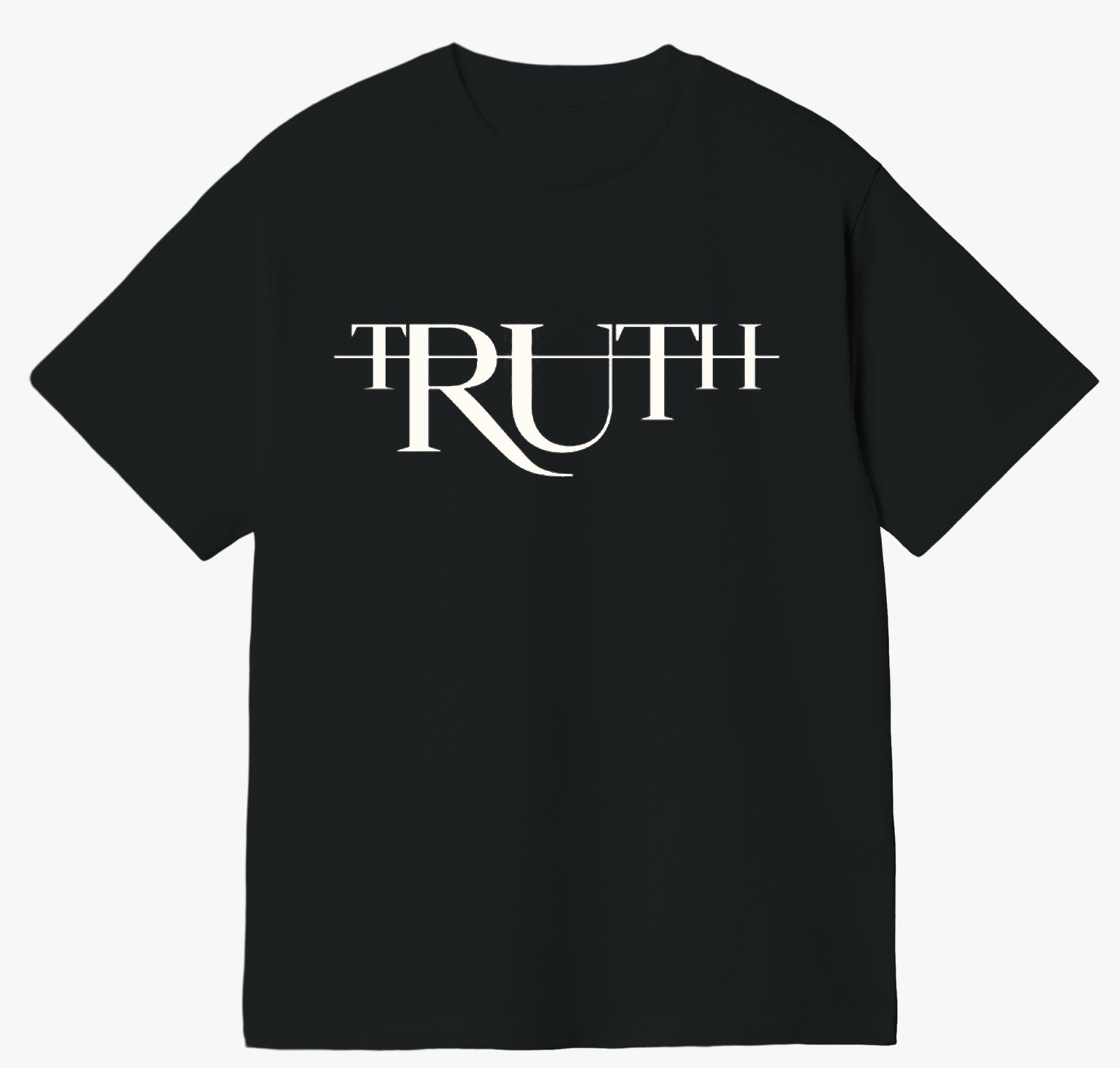This is a black T-shirt featuring the word “TRUTH” printed in a bold, elegant, and artistic serif font. The design is unique, with the letters interconnected and stylized in a way that creates a visually striking effect. The “R” has a sweeping, curved tail that flows into the “U,” giving the typography a dynamic and flowing appearance. Horizontal lines cross through the top of the letters, adding a modern, abstract touch. The white lettering contrasts sharply against the black background, making the design stand out prominently. The T-shirt has a minimalist yet sophisticated look, perfect for making a bold statement.