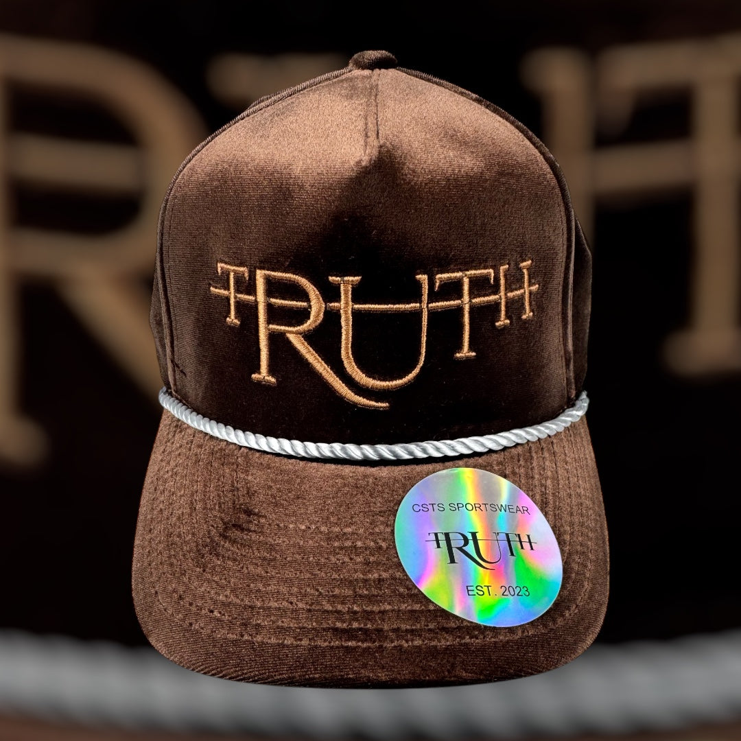 This is an elegant and luxurious snapback hat featuring a rich chocolate brown velvet finish with gold embroidery. It showcases a deep brown crown and matching brim made from plush velvet fabric, giving it a premium, sophisticated look with a touch of vintage flair. The word “TRUTH” is prominently embroidered on the front in luxurious gold letters, using a unique font style that incorporates cross-like elements on the “T”s. The shimmering gold embroidery contrasts beautifully against the dark brown velvet background, ensuring maximum visibility and a regal aesthetic.