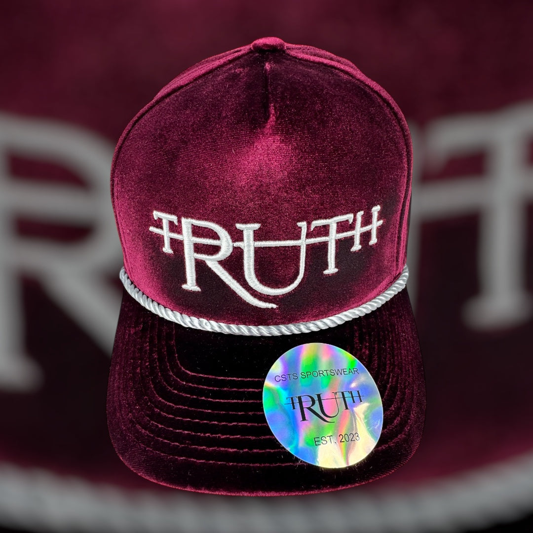 This is a luxurious and bold snapback hat featuring a rich burgundy velvet finish with elegant white embroidery. The hat showcases a plush, velvety crown and matching brim in a deep burgundy shade, giving it a premium, sophisticated look with a regal appeal. The word “TRUTH” is prominently embroidered on the front in crisp white letters, using a unique font style that incorporates cross-like elements on the “T”s. The white embroidery contrasts beautifully against the rich burgundy velvet background, ensuring maximum visibility and a striking aesthetic.