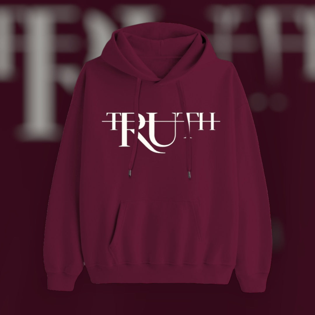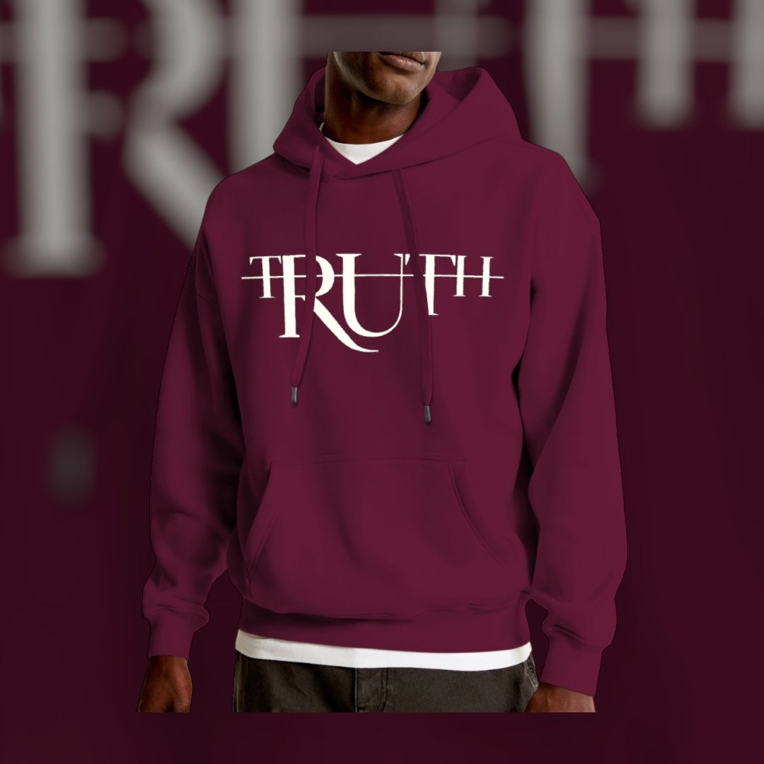This hoodie is a deep maroon color with a bold and artistic design on the front. The design features the word “TRUTH in a modern, stylized font with unique overlapping and intersecting lines, creating a striking visual effect. The central RU is larger and more prominent, giving a dynamic flow to the text. The white lettering contrasts sharply against the rich maroon background, enhancing the boldness of the design.