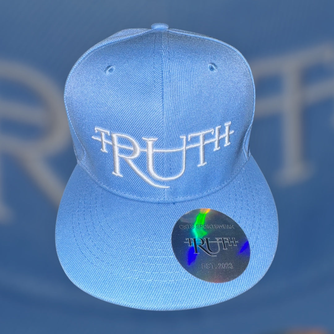 This is a vibrant and stylish snapback hat featuring a refreshing sky-blue color scheme. It showcases a soft blue crown and matching flat brim, creating a cohesive and cool appearance. The word “TRUTH” is prominently embroidered on the front in crisp white letters, using a unique font style that incorporates cross-like elements on the “T”s, adding a symbolic and impactful touch to the design. The high-quality white embroidery stands out beautifully against the blue background, ensuring a clean and eye-catching look.