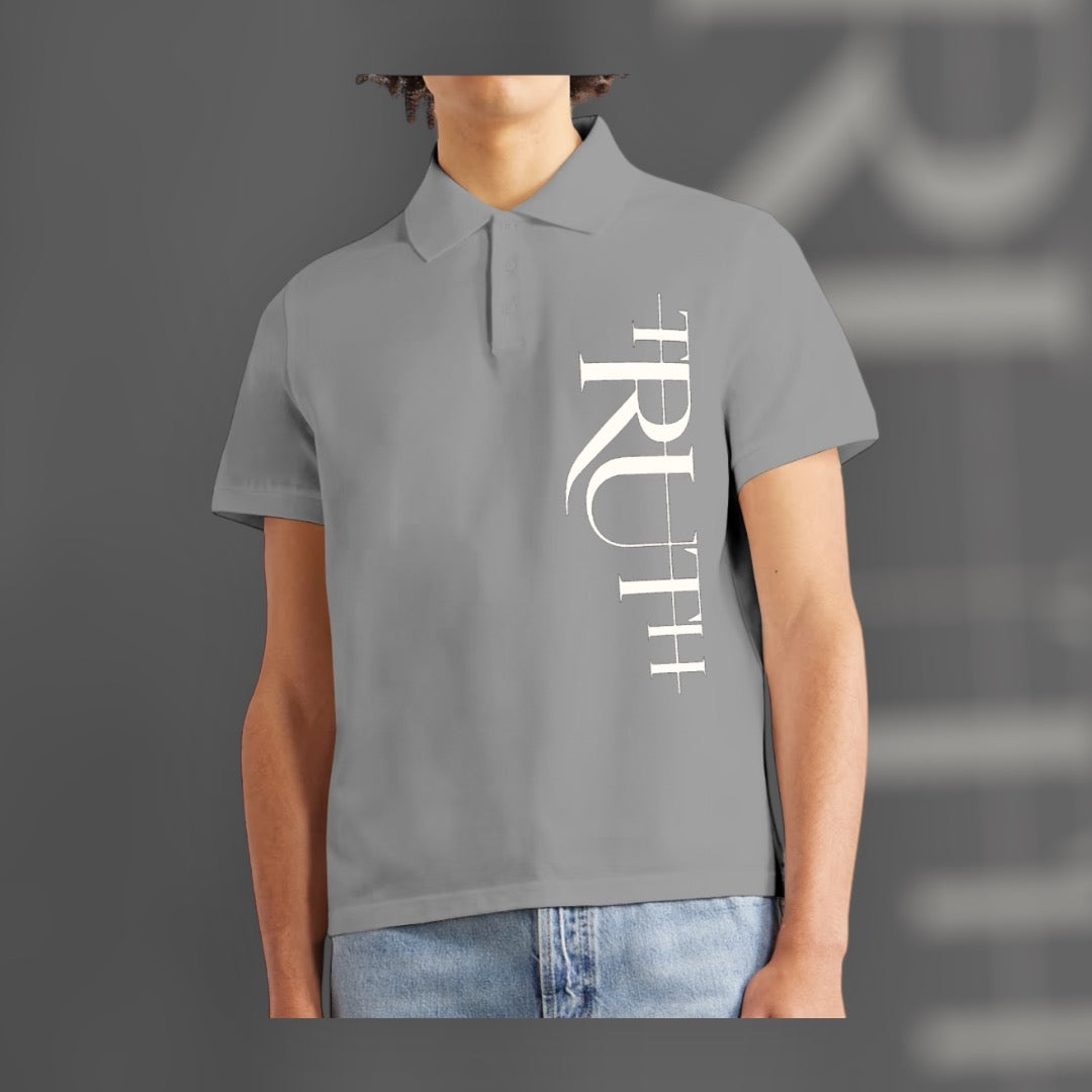 This is a stylish gray polo shirt featuring a modern, bold vertical design with the word TRUTH printed along the right side of the chest. The text is arranged vertically with a unique, artistic font, incorporating a cross-like element within the letters. The shirt has a classic polo collar with a clean, buttonless placket, and short sleeves that give it a casual yet refined look. It is paired with light blue jeans, enhancing its versatile, contemporary style suitable for both casual and semi-formal occasions.