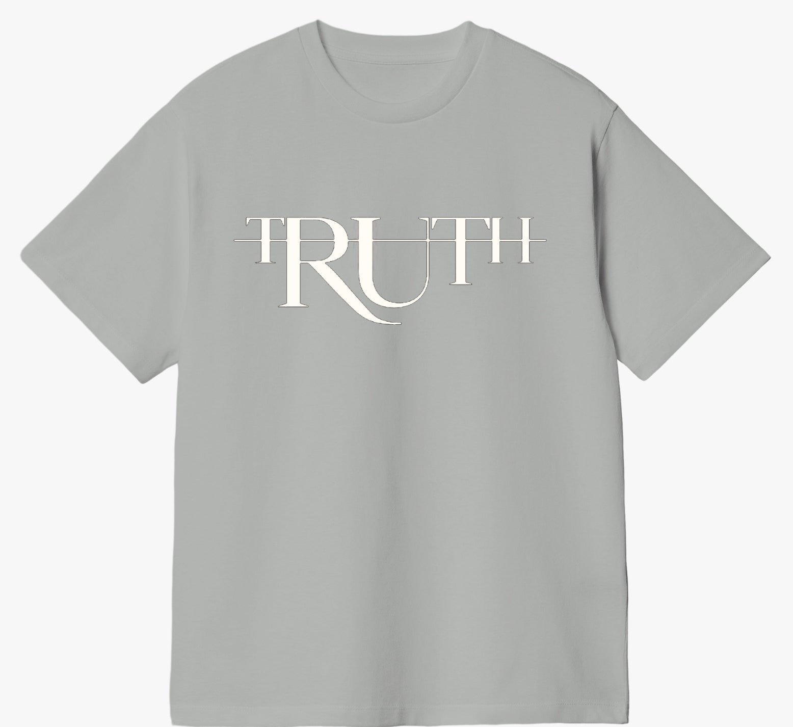 This T-shirt features a minimalist and elegant design. It is a light gray color with the word “TRUTH” prominently displayed across the chest in a stylized serif font. The typography is artistic, with elongated and intersecting lines that give it a sophisticated and modern look. The shirt has a classic crew neck and short sleeves, maintaining a relaxed and casual fit. The overall aesthetic is clean and stylish, suitable for a chic, understated look.