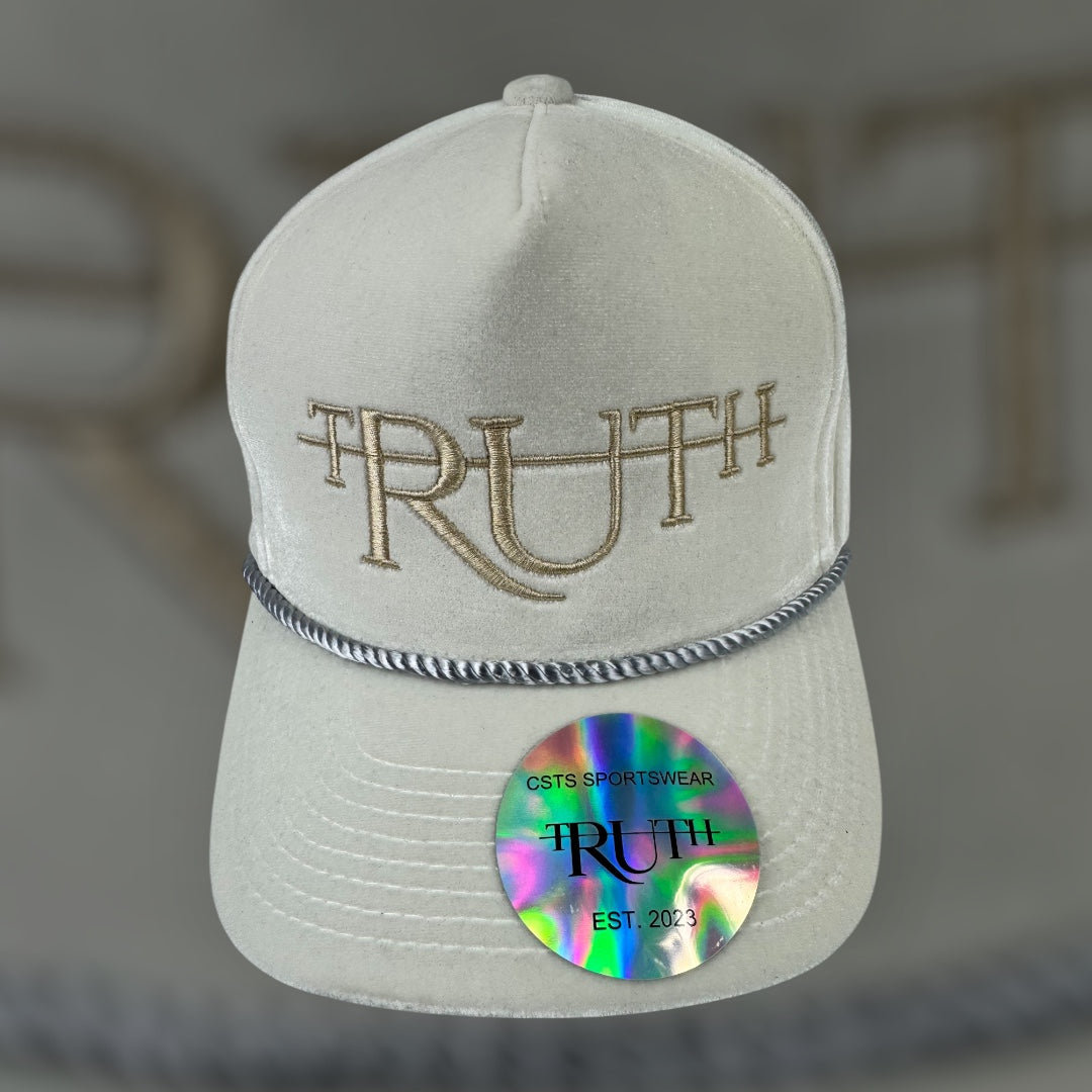 This is an elegant and luxurious snapback hat featuring a soft ivory colored velvet finish with sophisticated gold embroidery. The hat showcases a plush, velvety crown and matching brim in a light, neutral cream shade, giving it a premium and sophisticated look with a subtle vintage appeal. The word “TRUTH” is prominently embroidered on the front in refined gold letters, using a unique font style that incorporates cross-like elements on the “T”s. The gold embroidery beautifully complements the light cream background, creating a harmonious and upscale aesthetic.