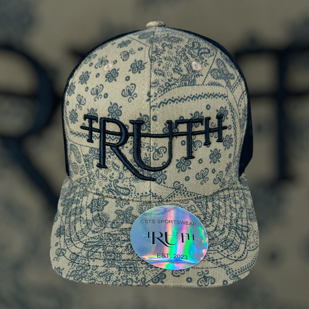 This hat features a detailed khaki and black paisley bandana pattern, giving it a vintage and stylish look. The front showcases bold, embroidered lettering of the word “TRUTH” in navy blue, with unique cross-like extensions on the “T” letters. It also includes a holographic sticker on the brim with the branding “CSTS SPORTSWEAR” and “TRUTH” along with the establishment year “EST. 2023.” The mesh back design suggests it’s a trucker-style cap, offering breathability and comfort. This hat blends streetwear aesthetics with a bold statement,