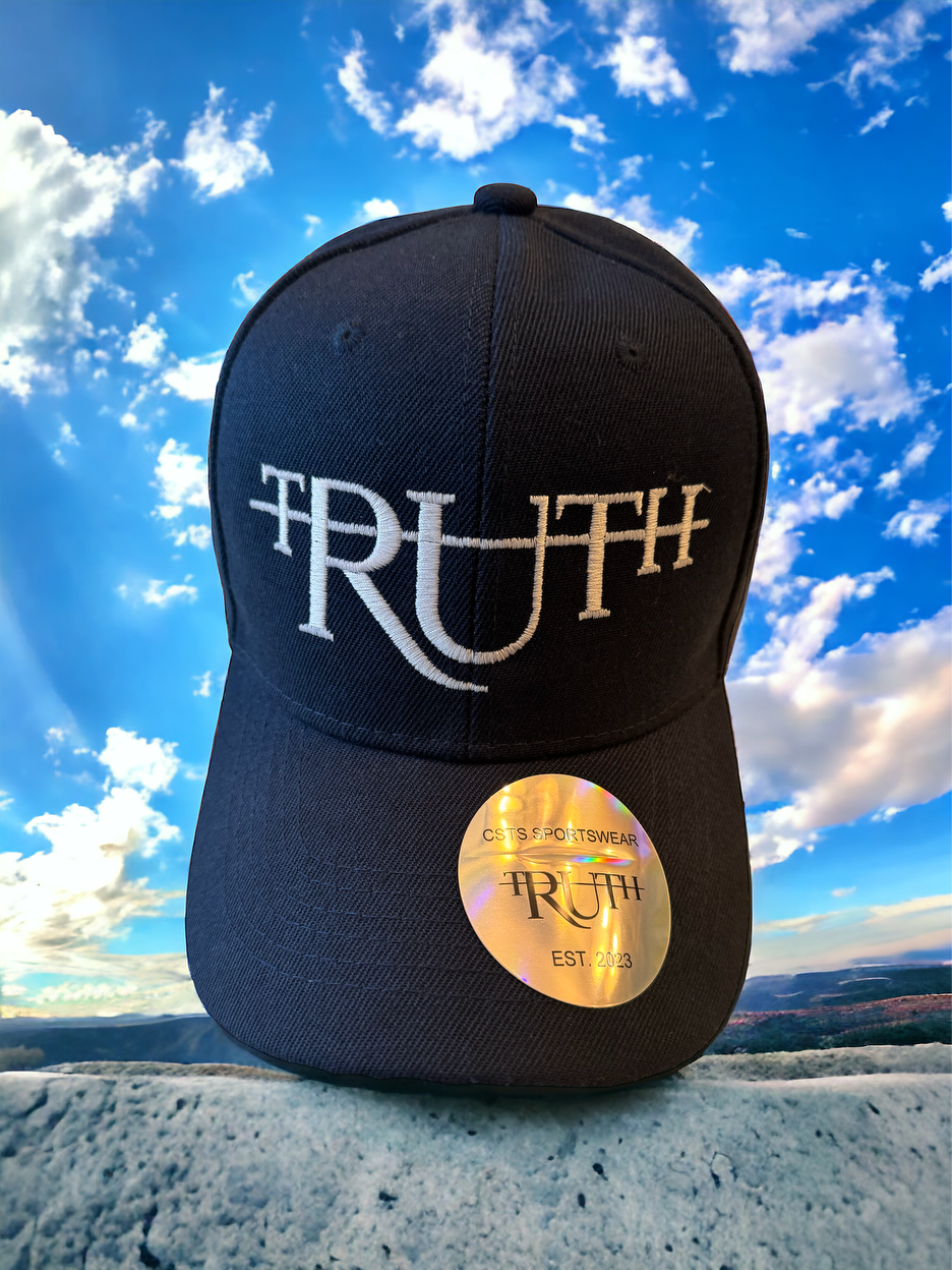 This is a sleek and bold snapback hat featuring a classic navy blue and white color scheme. It showcases a deep black crown and matching flat brim, creating a sharp and sophisticated look. The word “TRUTH” is prominently embroidered on the front in crisp white letters, using a unique font style that incorporates cross-like elements on the “T”s. The high-contrast white embroidery stands out vividly against the black background, ensuring maximum visibility and style.