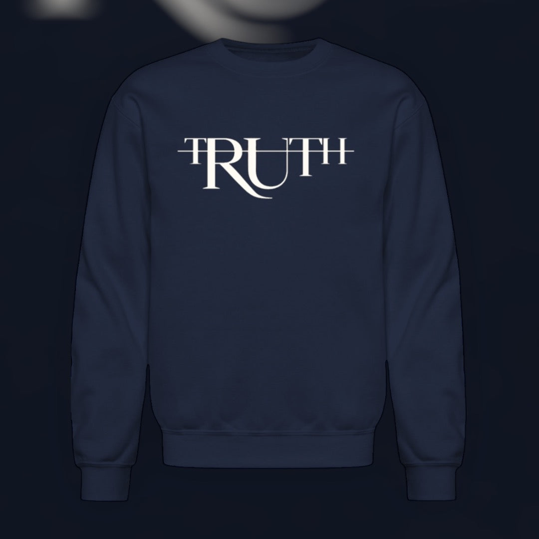 This is a navy blue crewneck sweatshirt featuring the word “TRUTH printed in a stylish, modern serif font on the chest. The design is creatively arranged with the letters interconnected, giving it a sophisticated and artistic appearance. The R has an elegant curved tail that flows into the U enhancing the overall aesthetic. The white text contrasts sharply against the dark background, making the design bold and eye-catching. The sweatshirt has a classic, relaxed fit with ribbed cuffs and waistband, suitable for casual or streetwear looks.