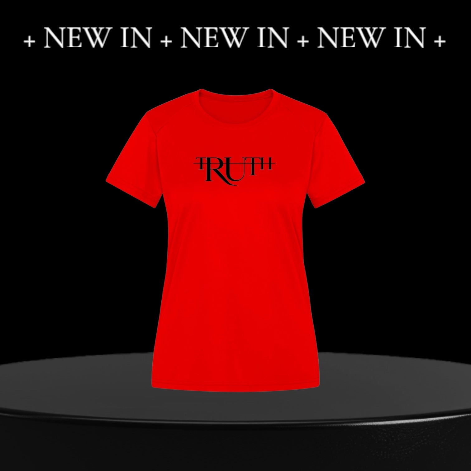 The shirt in the image is a vibrant red women’s t-shirt with a bold black text design on the front. The design prominently features the word “TRUTH” in a stylized font, with some letters slightly altered or adorned with decorative elements, including small crosses. The shirt has a classic crew neck and short sleeves, giving it a casual and modern look. The background of the image is dark, with a circular platform beneath the shirt, and the words “+ NEW IN +” repeated at the top, suggesting that this design is a new release