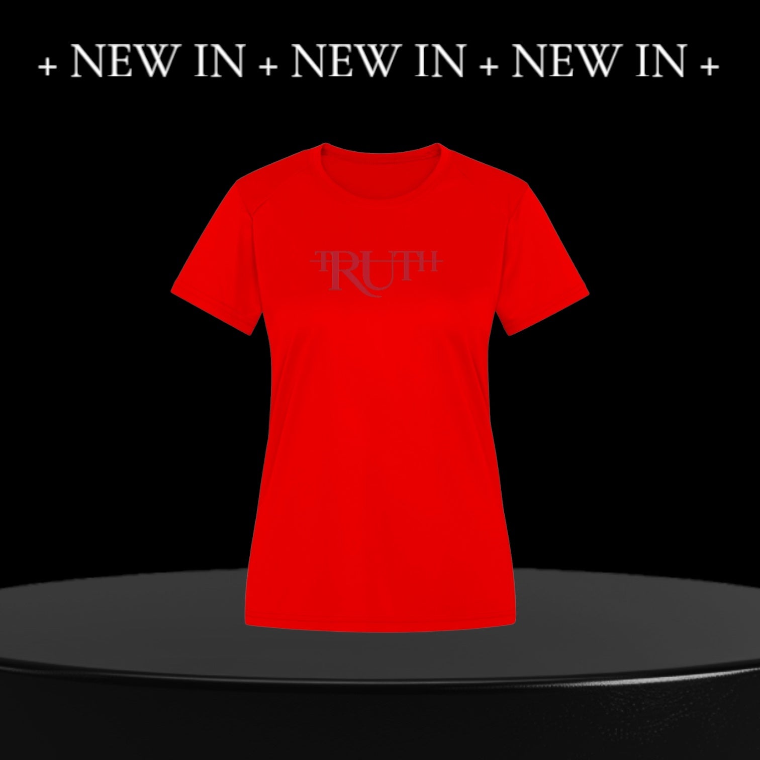 This shirt is a vibrant red, short-sleeved, fitted women’s t-shirt. It features a subtle yet stylish design in the center of the chest area, displaying the word “TRUTH” with artistic typography that includes cross-like extensions on the letters. The shirt is displayed on a sleek black platform with a minimalistic background, emphasizing its bold color. Above the shirt, the phrase “+ NEW IN +” is repeated, indicating that it is a newly released item. The combination of the red fabric and dark design elements creates a striking yet sophisticated look