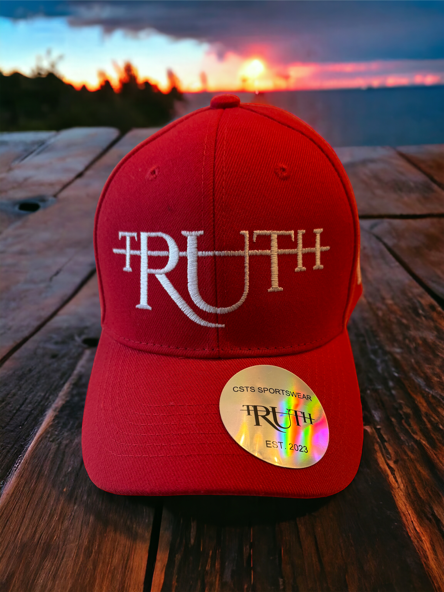 This is a bold and dynamic fitted cap featuring a vibrant red and white color scheme. It showcases a striking red crown and matching curved brim, creating a bright and energetic look. The word “TRUTH” is prominently embroidered on the front in crisp white letters, using a unique font style that incorporates cross-like elements on the “T”s. The high-contrast white embroidery stands out vividly against the bold red background, ensuring maximum visibility and style.