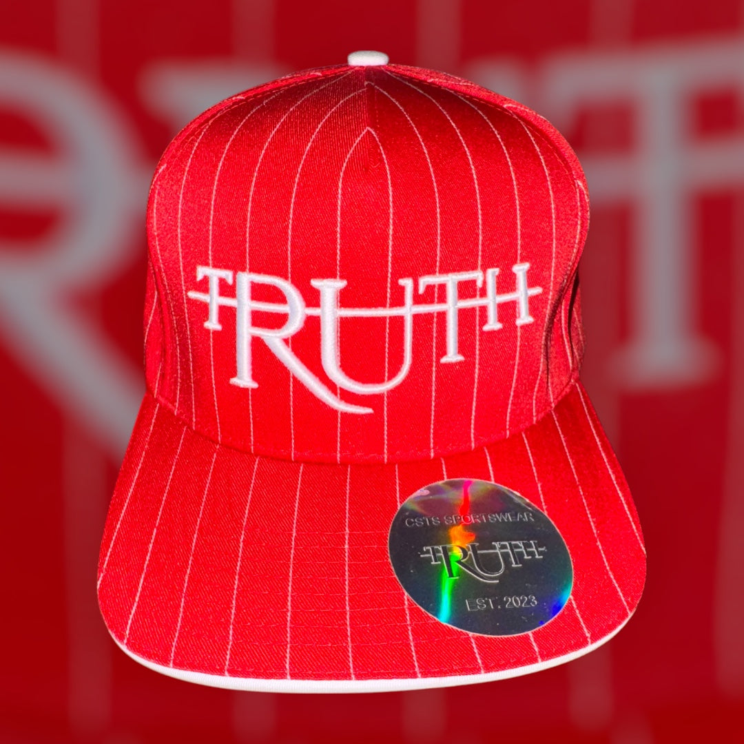 This is a vibrant and sporty snapback hat featuring a bold red and white pinstripe design. It showcases a bright red crown and flat brim adorned with thin vertical white pinstripes, giving it a vintage baseball-inspired appearance with a modern twist. The word “TRUTH” is prominently embroidered on the front in crisp white letters, using a unique font style that incorporates cross-like elements on the “T”s, adding a symbolic and impactful touch to the design. The high-contrast white embroidery pops beautifully against the vivid red background, ensuring maximum visibility and style.