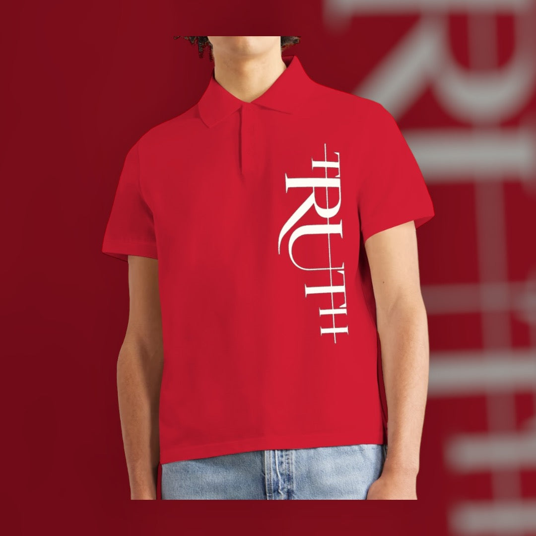 This is a vibrant red polo shirt with a classic collar and short sleeves. The standout feature of this design is the bold vertical text “TRUTH printed in white on the right side of the shirt. The typography is artistic, with the letters stacked and aligned in an eye-catching, slightly distorted style that adds a modern and edgy flair to the shirt. The contrast between the bright red fabric and the white text makes the design striking and visually appealing.