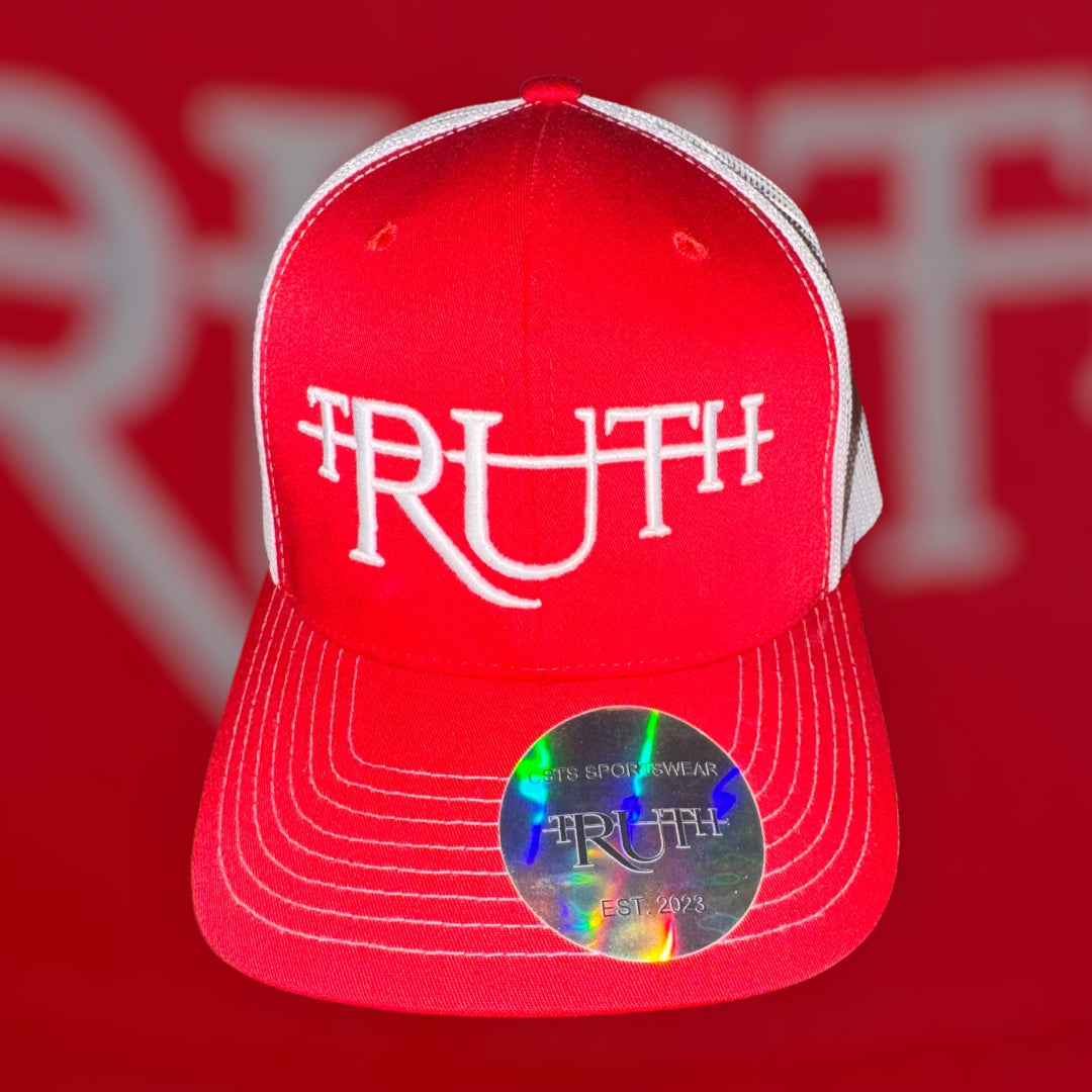 This is a bold and vibrant snapback trucker hat with a striking red and white color scheme. It features a bright red front panel and flat brim, complemented by white mesh panels on the sides and back, giving it a classic trucker style with excellent breathability. The word “TRUTH” is prominently embroidered on the front in crisp white letters, using a unique font that includes cross-like elements on the “T”s, enhancing the symbolic and impactful look.