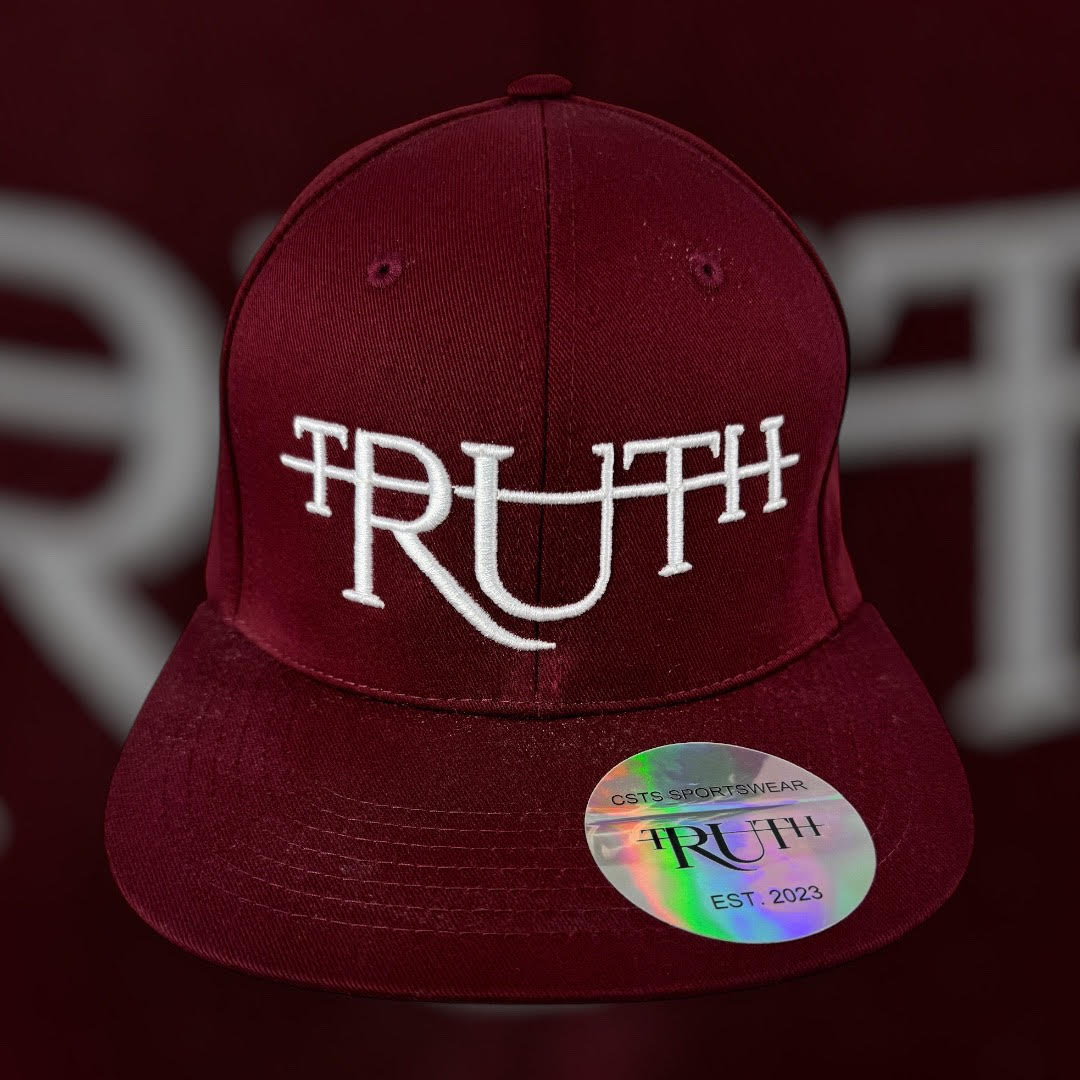 This is a maroon snapback hat with a flat brim, featuring the word “TRUTH” embroidered in bold white letters on the front. The design creatively incorporates a cross within the first “T” of “TRUTH,” giving it a unique and symbolic look. The hat has a holographic sticker on the brim that reads “CSTS SPORTSWEAR” and “EST. 2023,” indicating the brand and its establishment year. The overall style is modern and sleek, making it a fashionable statement piece.