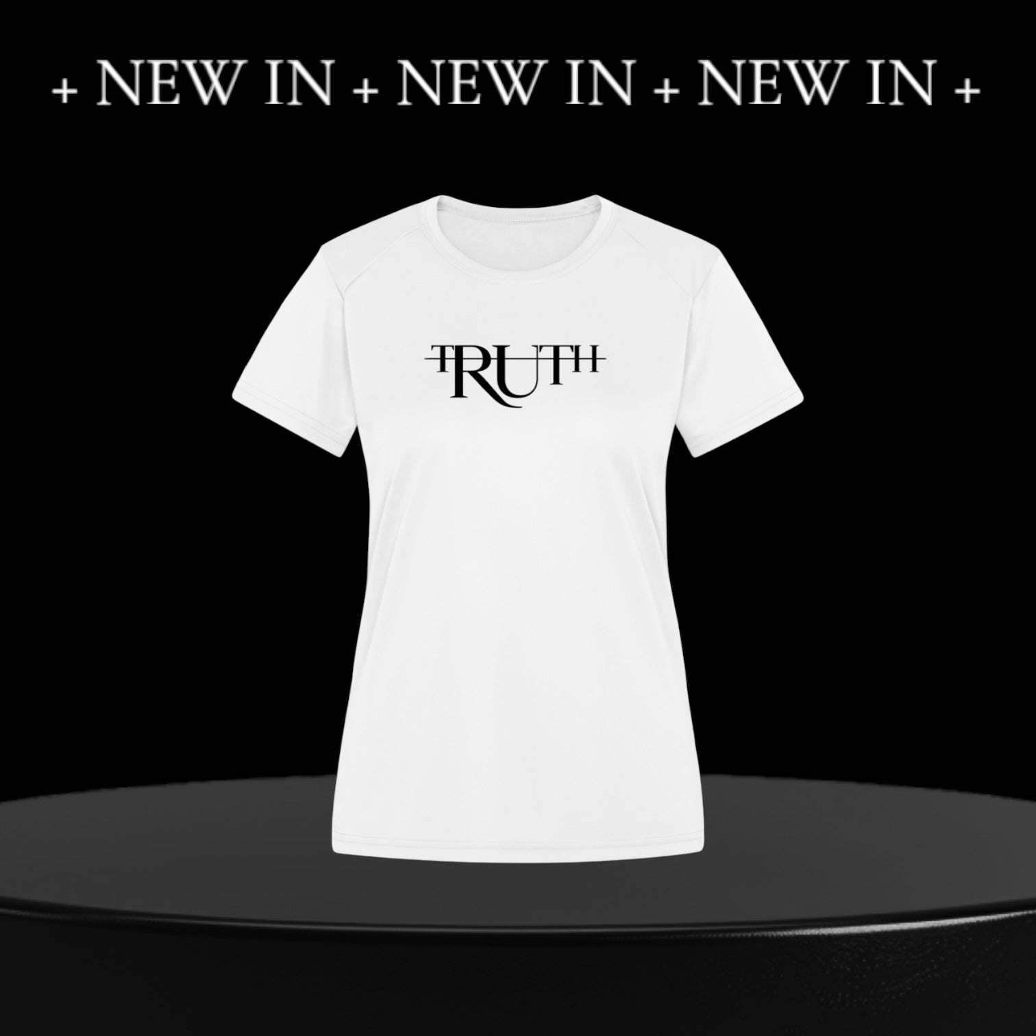This is a women’s white t-shirt with a minimalist yet bold design. The shirt features the word “TRUTH” in black, stylized typography with cross-like extensions on the letters, giving it a gothic or modern spiritual aesthetic. The fabric appears to be lightweight and breathable, suitable for casual wear.