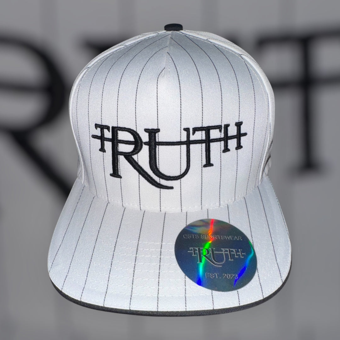 This is a sleek and sporty snapback hat featuring a classic white and black pinstripe design. It showcases a white crown and flat brim adorned with thin vertical black pinstripes, giving it a vintage baseball-inspired look. The word “TRUTH” is boldly embroidered on the front in striking black letters, using a distinctive font that incorporates cross-like elements on the “T”s, adding a symbolic and impactful touch to the design. The high-contrast black embroidery stands out vividly against the white pinstriped background, making the text pop.