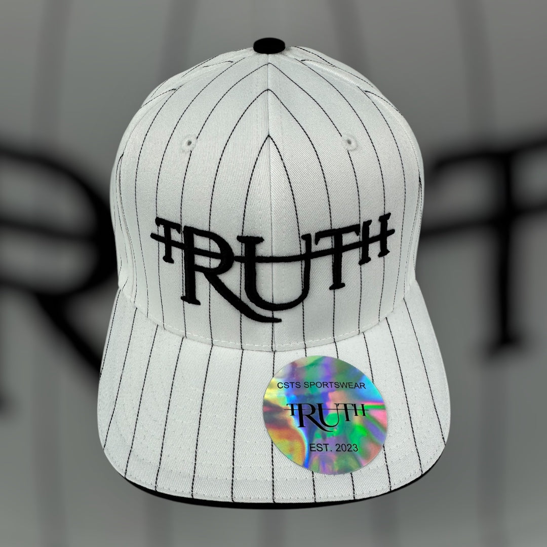 This is a bold and elegant snapback hat featuring a classic white and black pinstripe design. It showcases a crisp white crown and matching flat brim adorned with thin vertical black pinstripes, giving it a vintage-inspired look reminiscent of traditional baseball uniforms with a modern, sophisticated twist. The word “TRUTH” is prominently embroidered on the front in bold black letters, using a unique font style that incorporates cross-like elements on the “T”s. The high-contrast black embroidery stands out vividly against the white pinstriped background, ensuring maximum visibility and style.