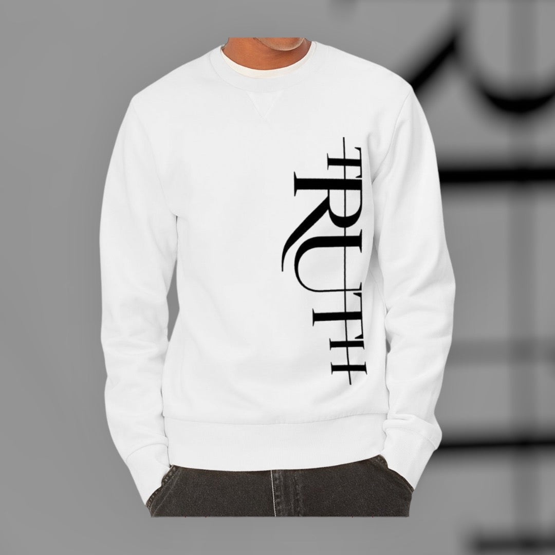This is a stylish white crewneck sweatshirt with a minimalist yet bold design. The standout feature is the vertical black text that spells TRUTH in an elegant, modern serif font. The letters are arranged vertically along the right side of the sweatshirt, giving it a sleek and contemporary look. The crew neck has a distinctive, artistic curve that adds a unique flair to the design.