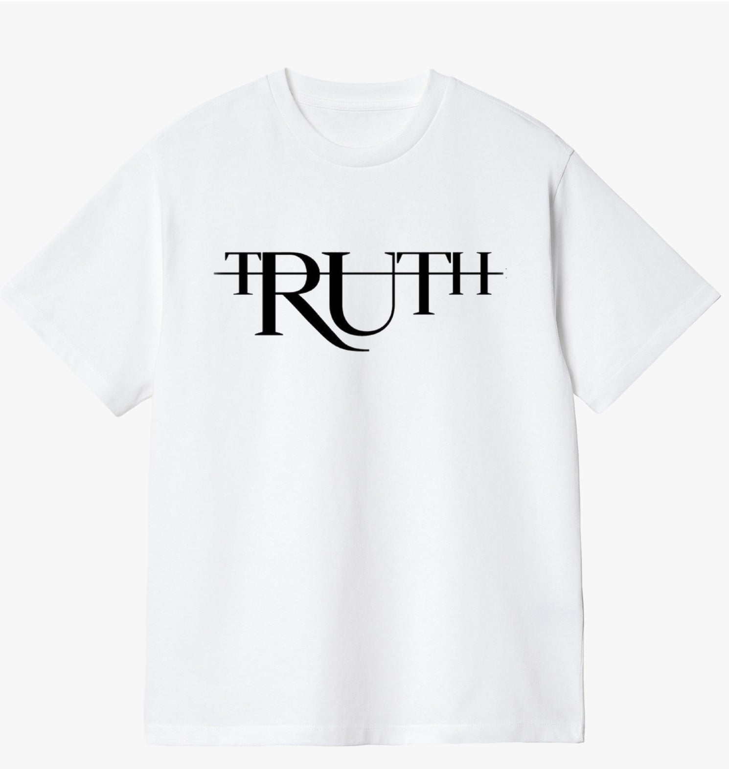 This is a white T-shirt featuring the word “TRUTH” in bold black letters on the front. The text is styled in an elegant, gothic-inspired font with intricate curves and extensions that connect the letters, giving it a sophisticated and artistic appearance. The stark black lettering contrasts sharply against the clean white background, making the design stand out clearly. This minimalist yet bold combination creates a modern and stylish look, suitable for a variety of casual outfits.