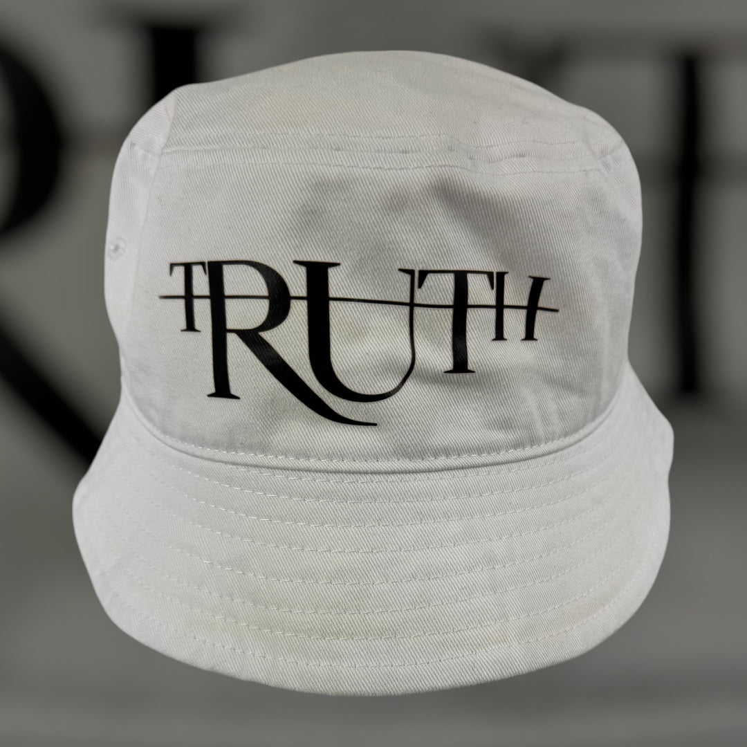 This is a clean, white bucket hat featuring the word “TRUTH” prominently printed in bold black lettering on the front. The text is crafted in an elegant, gothic-inspired font with artistic curves and extensions that interconnect the letters, giving it a sophisticated and striking appearance. The sharp black print contrasts vividly against the bright white fabric, creating a crisp and modern look. The minimalist design and bold typography make this bucket hat a versatile accessory, suitable for both casual and streetwear styles.