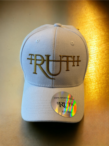 This is an elegant and luxurious fitted cap featuring a refined white and gold color scheme. It showcases a crisp white crown and matching curved brim, creating a clean and sophisticated look. The word “TRUTH” is prominently embroidered on the front in rich metallic gold letters, using a unique font style that incorporates cross-like elements on the “T”s. The shimmering gold embroidery stands out beautifully against the white background, giving the hat a regal and elegant appearance.
