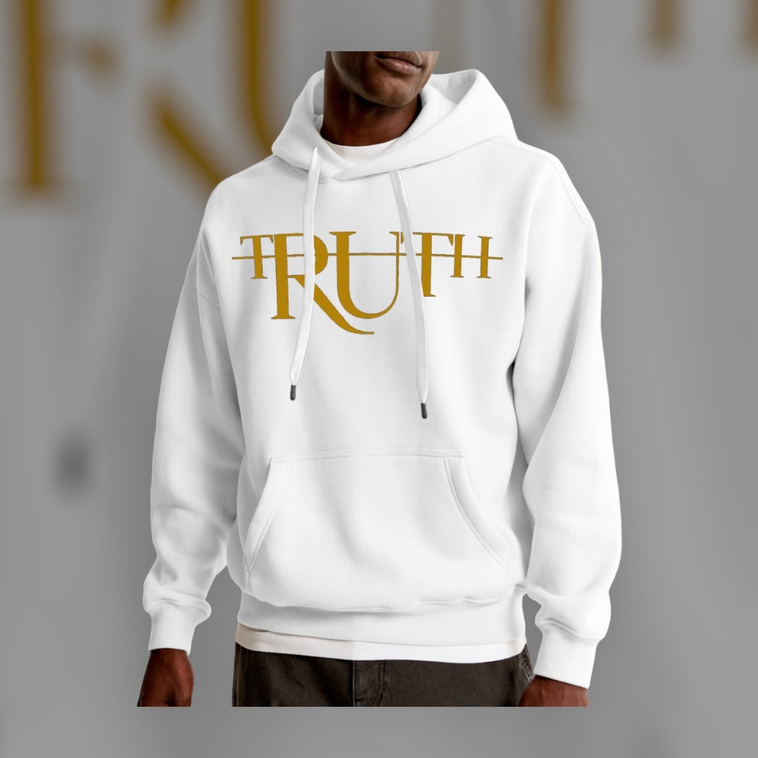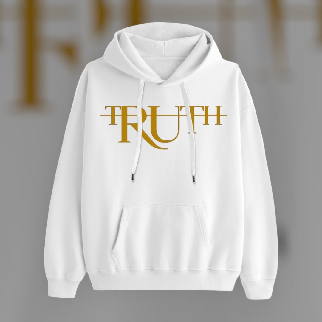 This is a white hoodie featuring a bold, stylish design with the word TRUTH printed across the chest in gold lettering. The typography is artistic, with a unique arrangement where the letters are interconnected by horizontal lines. Notably, the R has a creative, flowing curve that stands out, giving the design a modern and elegant feel. The hoodie has a classic pullover style with an adjustable drawstring hood and a front kangaroo pocket. The minimalist yet impactful design makes it versatile and fashionable for casual wear.