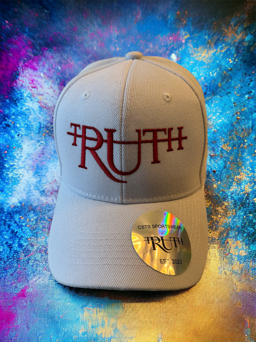 This is a stylish and modern snapback hat featuring a clean white and bold red color scheme. It showcases a soft beige crown and matching flat brim, creating a neutral and versatile base. The word “TRUTH” is prominently embroidered on the front in vibrant red letters, using a unique font style that incorporates cross-like elements on the “T”s. The bright red embroidery stands out beautifully against the white background, ensuring maximum visibility and style.