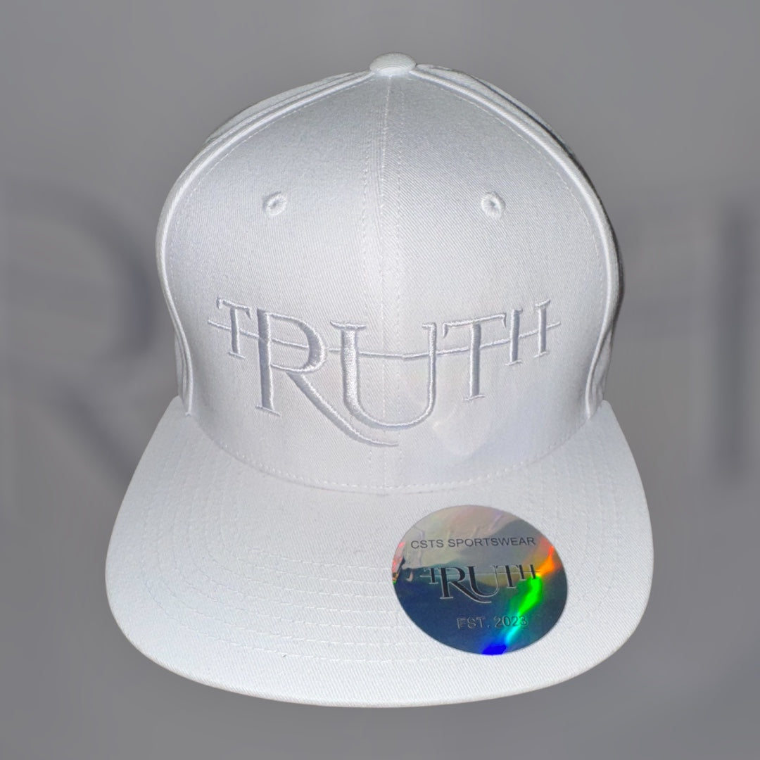 This is a sleek and minimalist snapback hat with an all-white design. It features a crisp white crown and a matching white flat brim, creating a clean and fresh look. The word “TRUTH” is embroidered on the front in white, maintaining a monochromatic aesthetic. The unique font style includes cross-like elements in the “T”s, giving the design a subtle yet impactful appearance. The tonal embroidery adds a sophisticated, textured look that stands out through its raised design.